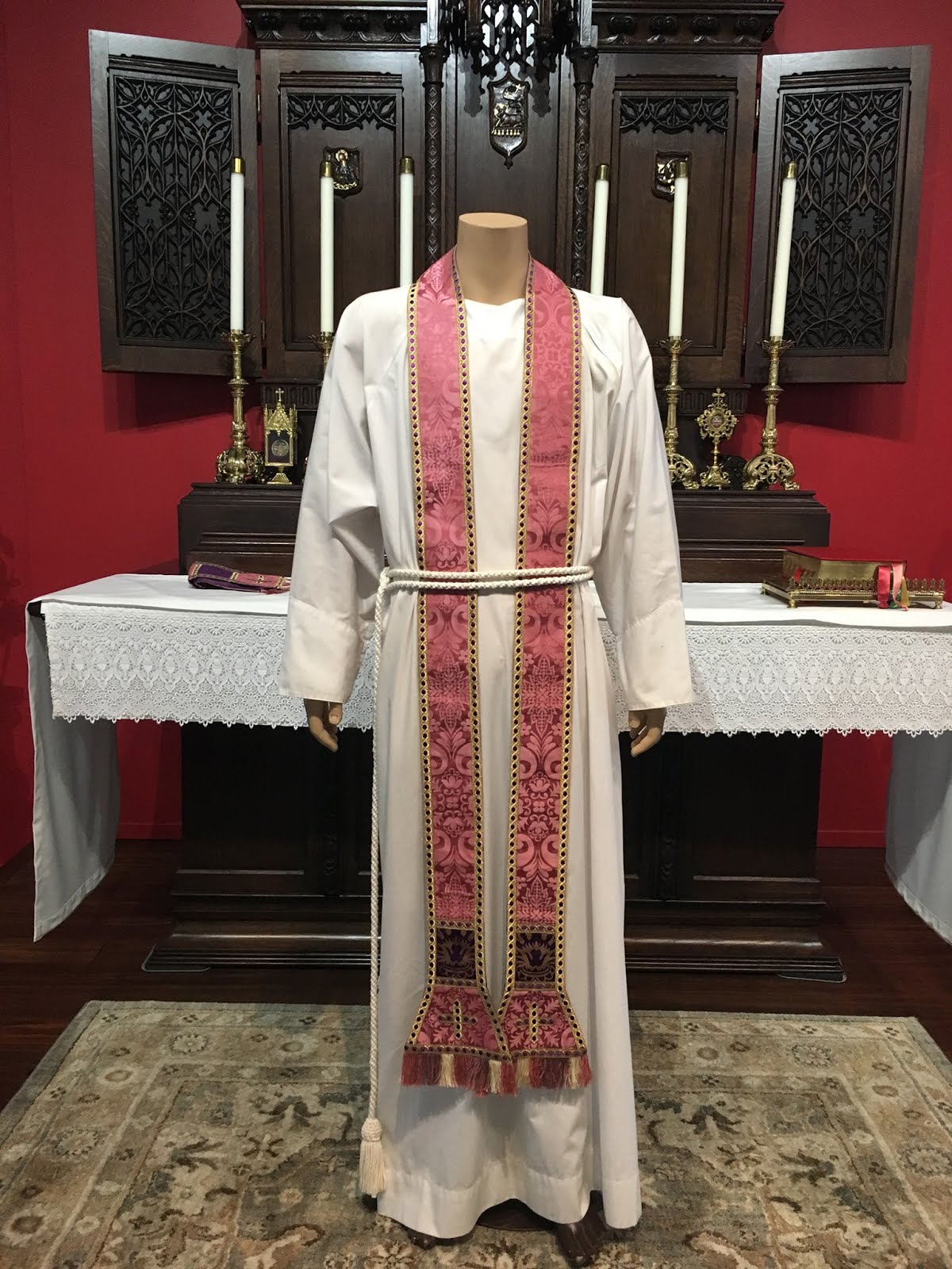 The rose face fabric and purple brocade are Watts & Co. fabrics. The hand-embroideries on the vesicas front and back were done in Pakistan. The Tudor rose on the rear vesica is fitting because it is a set for Rose Sundays, and also because it is the traditional floral heraldic emblem of England, and the Ordinriate’s purpose is to preserve the liturgical traditions of the Anglican patrimony. Almy produced the set at their workshop in Maine. The parish that commissioned the set is Holy Martyrs of England & Wales, an Ordinariate congregation in Murrieta, CA.